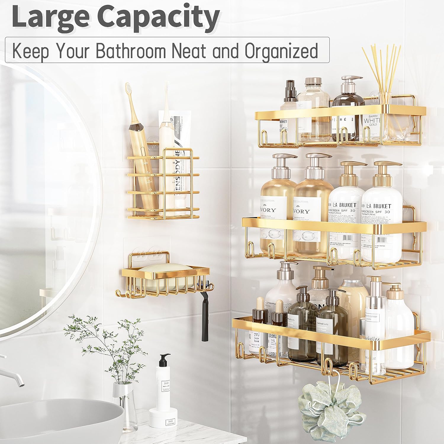 Add a touch of opulence to your bathroom with the AurumHaven Gold Shower Caddy Set. This 5-piece organizer set, crafted from rustproof stainless steel with a luxurious gold finish, is the perfect blend of elegance and functionality. Designed to maximize storage, the spacious baskets securely hold shampoo, conditioner, and other essentials, while the self-adhesive installation ensures a no-drill, damage-free setup.